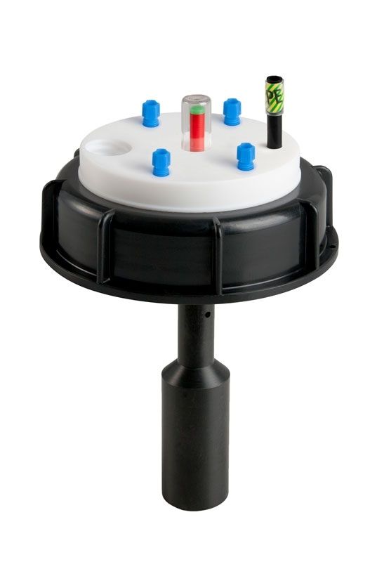 A PTFE Safety Waste Cap with 4 capillary connections, a grounding connection and 1 mechanical level control.