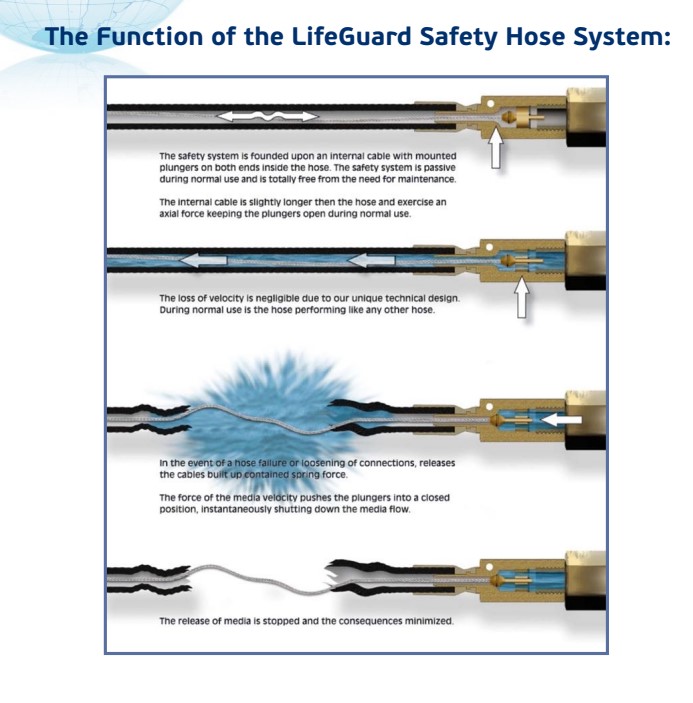 LifeGuard Safety Hose Technology’s Safety Shut Off System. The hydrogen industry’s only hose and coupling system that instantly and automatically shuts off the flow of fluids in both directions.