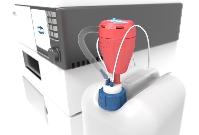 A PTFE Safety Waste Cap with 2 capillary connections, 1 tube connection and a grounding connection.