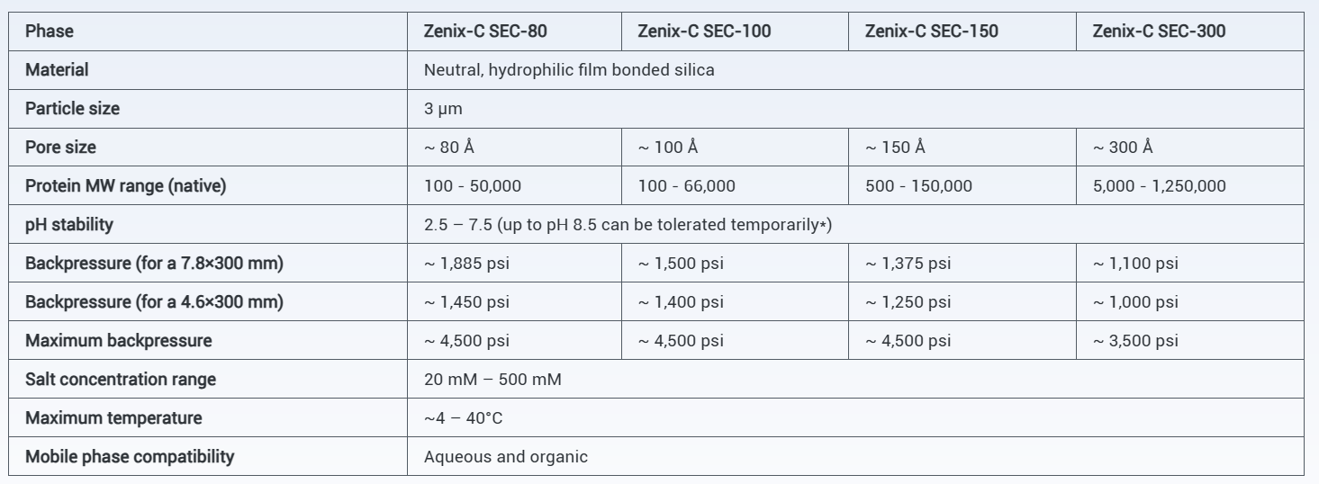 Zenix®-C SEC phase, developed based on innovative surface coating technology, comprises of uniform, hydrophilic, and neutral nanometer thick film chemically bonded to high purity and mechanically stabilized silica.